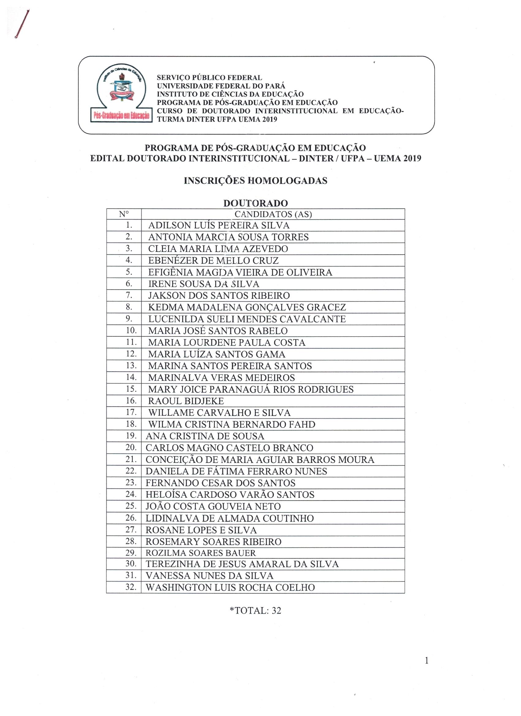 - Homologação das inscrições ao Processo Seletivo DINTER UEMA-UFPA