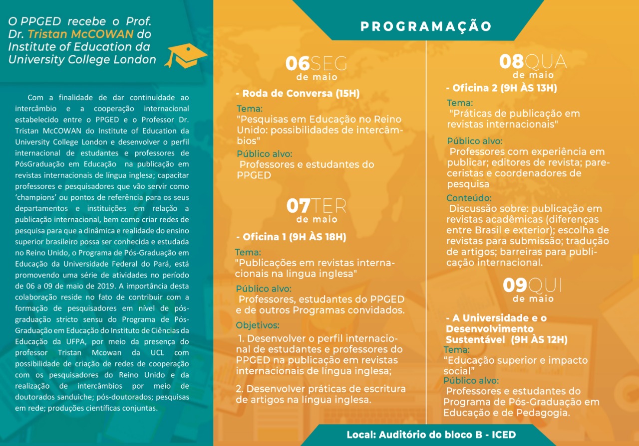 Oficina sobre Produção Internacional com Tristán McCowan Postada em: 22/04/2019 Oficina sobre Produção Internacional com o Prof. Tristán McCowan (University College of London), do Reuno Unido. De 06 à 09 de maio de 2019 no Auditório B do ICED. Fonte:Coordenação