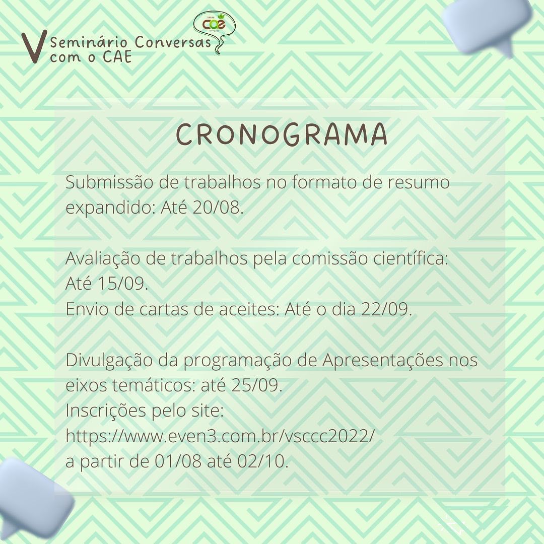 V Seminário Conversas com o CAÊ - os desafios da formação política na Educação e na Educação Física. O evento ocorrerá entre os dias 04 e 06 de outubro no Auditório B do Instituto de Ciências da Educação