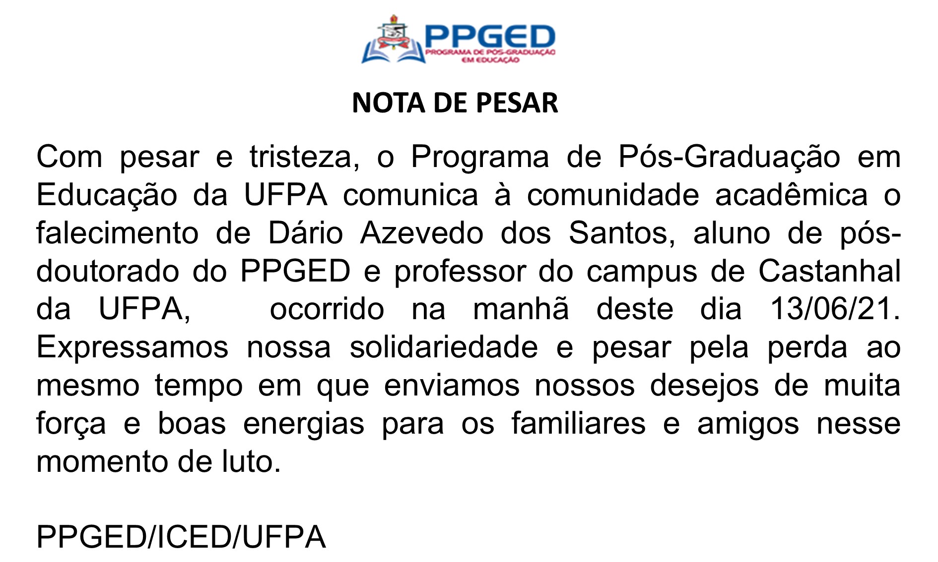 NOTA DE PESAR Com pesar e tristeza, o Programa de Pós-Graduação em Educação da UFPA comunica à comunidade acadêmica o falecimento de Dário Aze...
