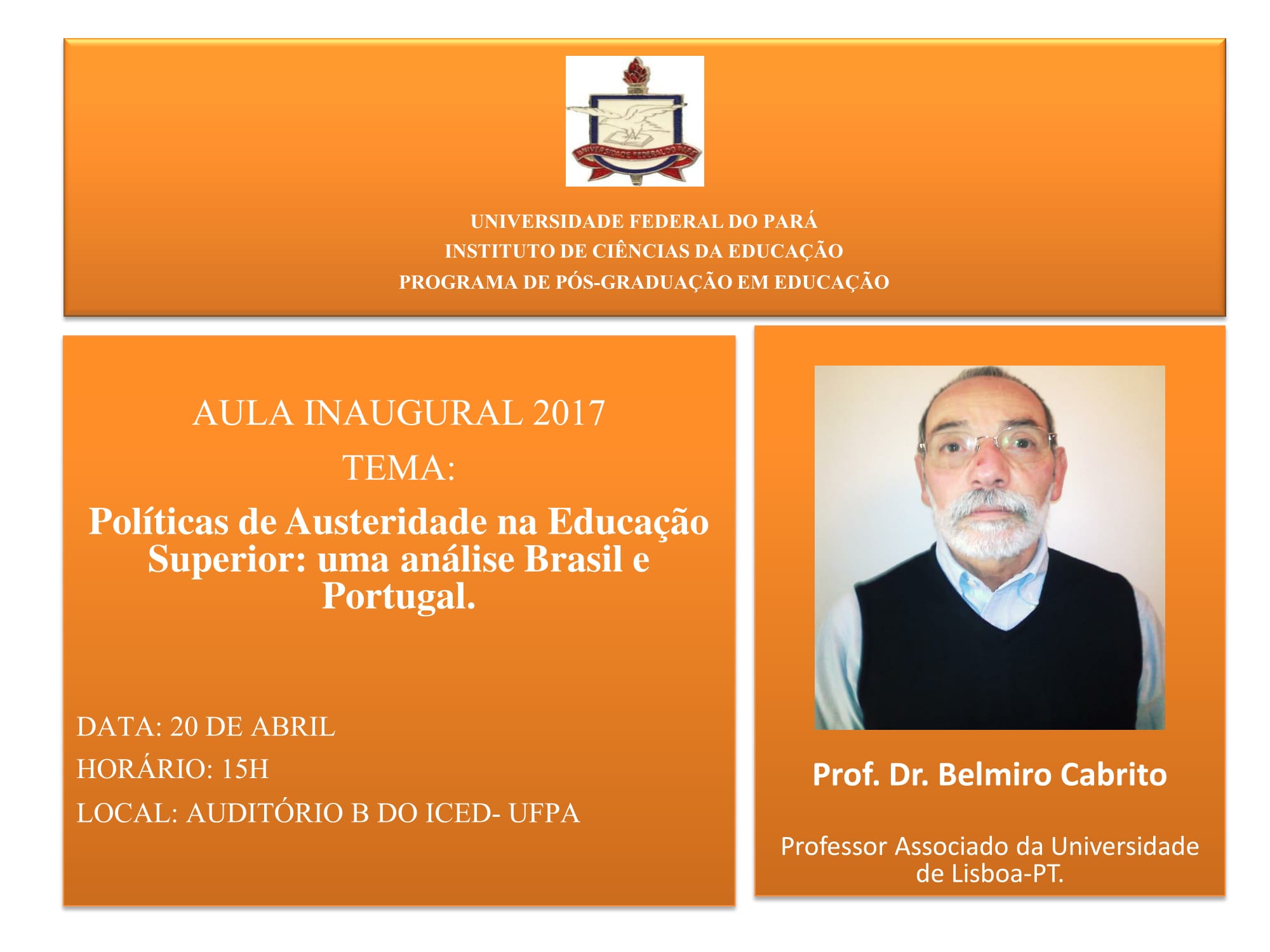 AULA INAUGURAL 2017 TEMA: Políticas de Austeridade na Educação Superior: uma análise Brasil e Portugal. DATA: 20 DE ABRIL ÀS 15H LOCAL: AUDITÓRIO B D...