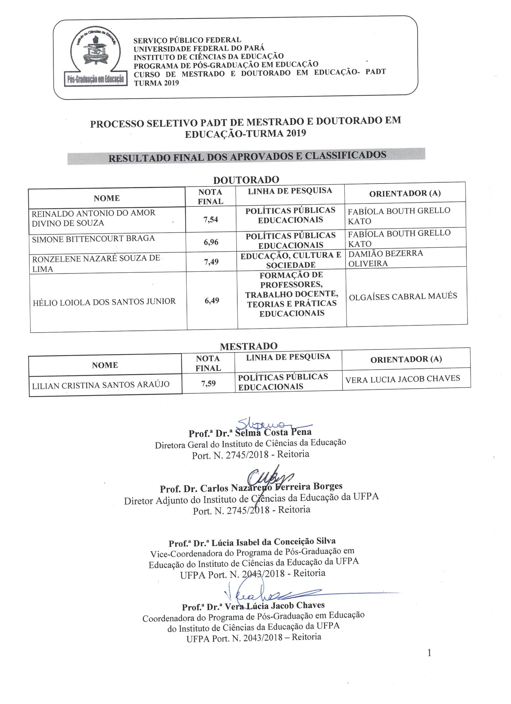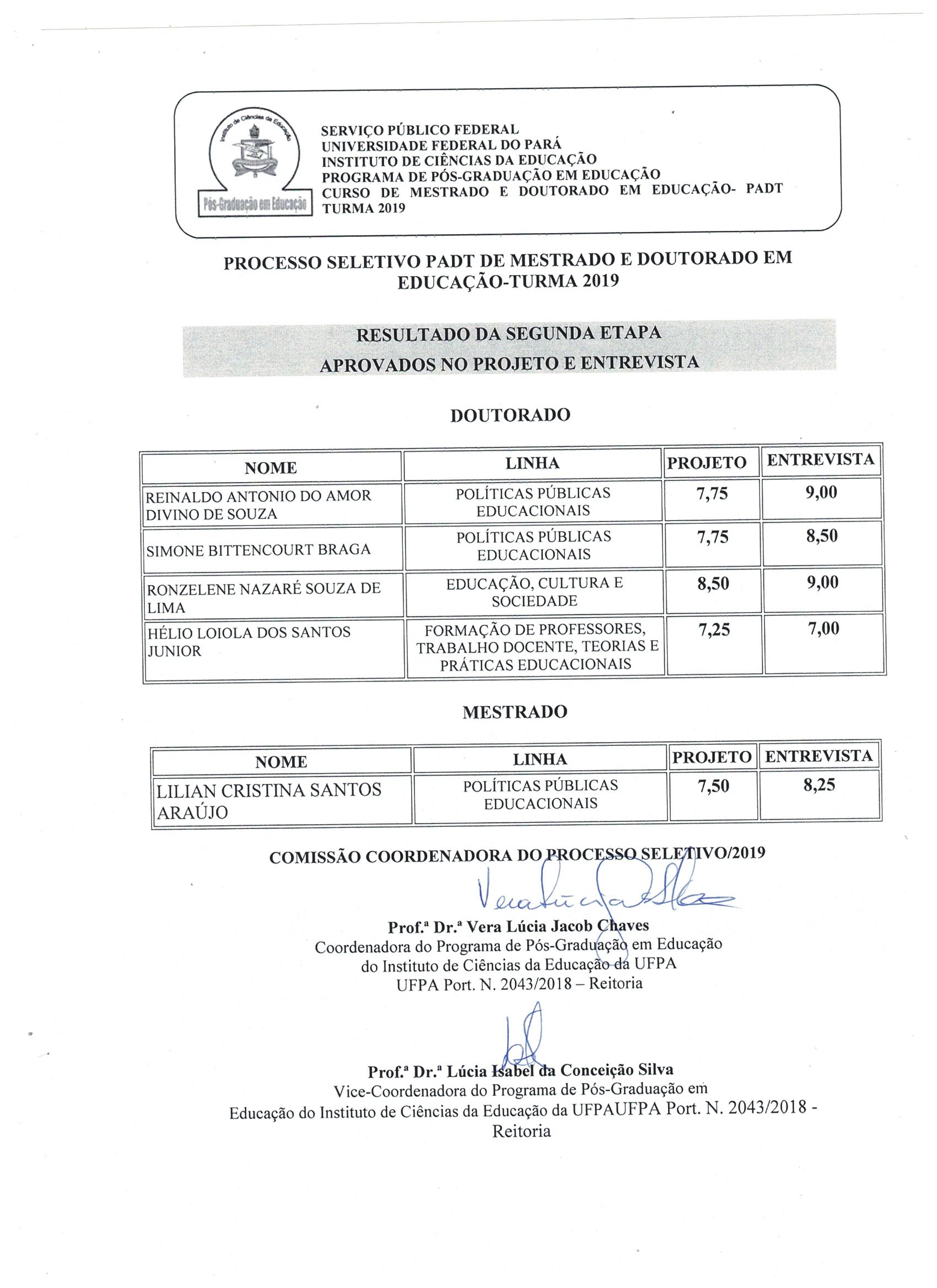 Edital Processo Seletivo 2019: https://ppgedufpa.com.br/noticia.php?id=145