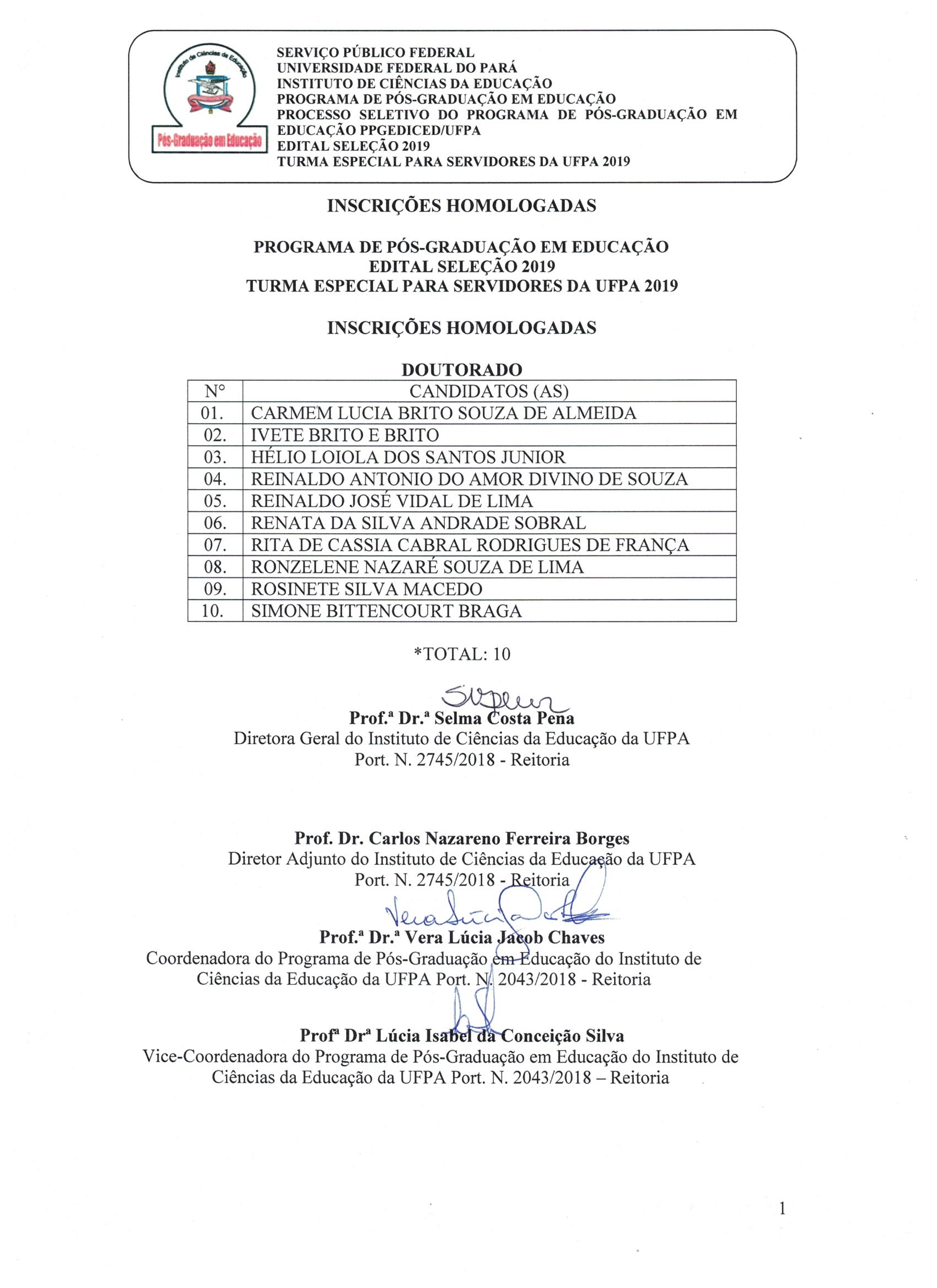 Relação dos candidatos ao Doutorado em Educação inscritos e homologados ao Processo Seletivo Especial (PADT/PROPEP) do PPGED.
